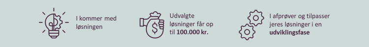 Vi udvælger højest fem løsninger til afprøvning i udviklingsfasen. Hver samarbejdspartner kan modtage op til 100.000 kr. til at arbejde videre med deres løsning og afprøve den i praksis.